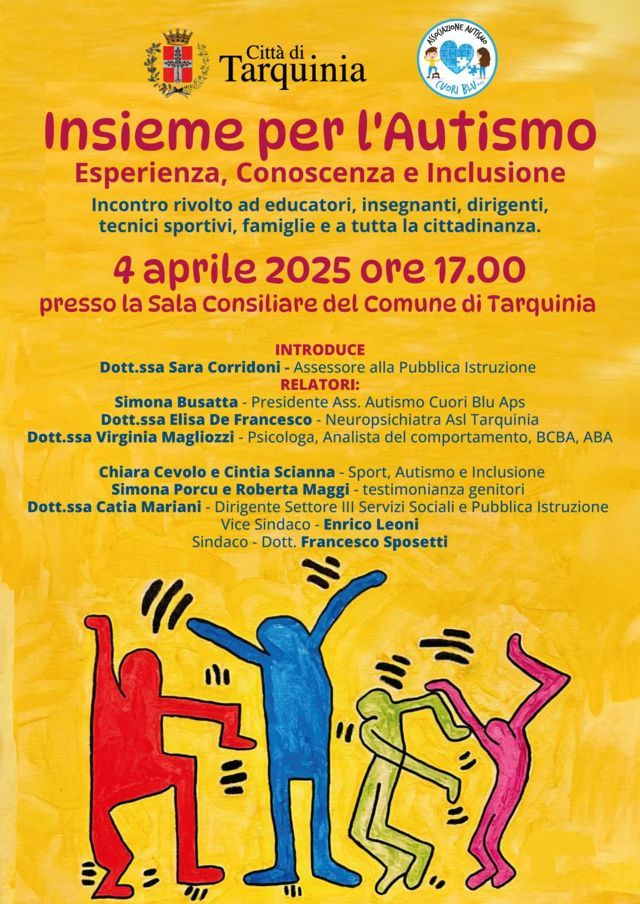 Nella sala consiliare del palazzo comunale si terrà venerdì 4 aprile, alle 17, il convegno “Insieme per l’autismo” promosso dal Comune di Tarquinia e dall’associazione autismo Cuori Blu Aps. L’incontro, rivolto a educatori, insegnanti, dirigenti, tecnici sportivi, famiglie e cittadini, avrà come obiettivo quello di sensibilizzare e approfondire le tematiche relative all’autismo, con un focus